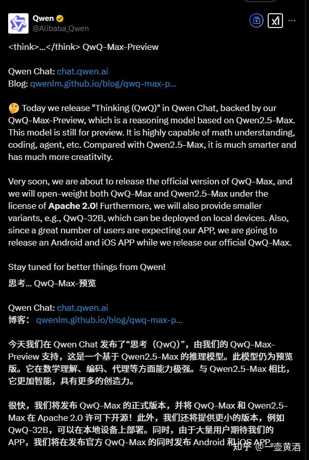 1. 阿里出了推理模型QwQ-Max的预览版,在数学理解、编码、代理等方面能力极强。与 Qwen2.5-Max 相比,它更加智能,具有更多的创造力