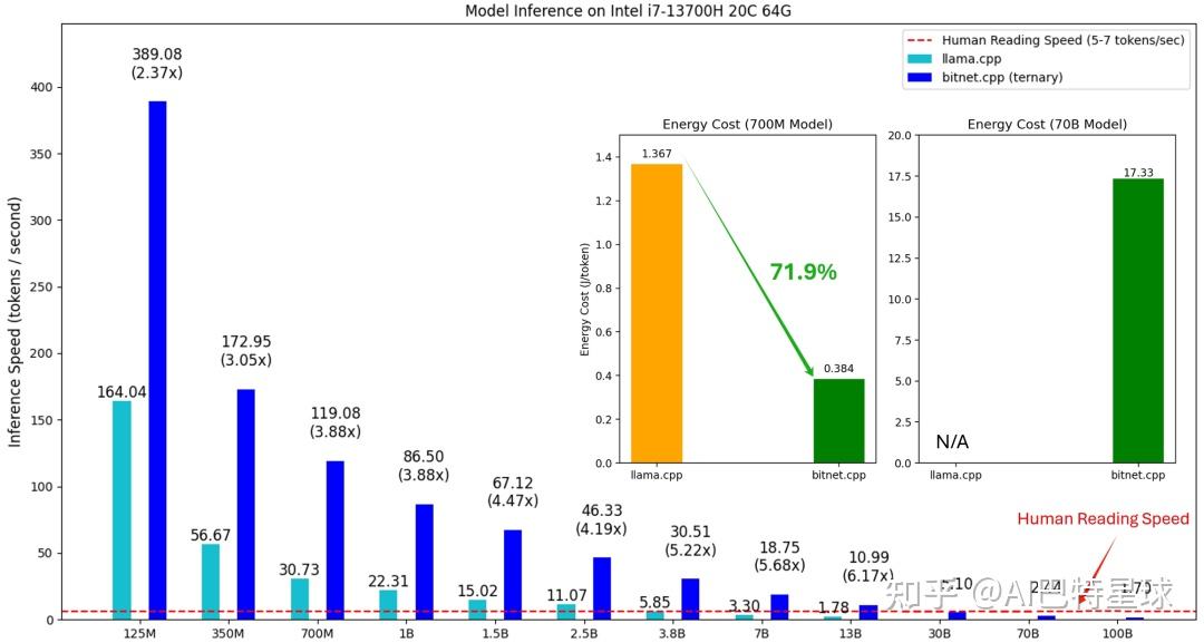 在对比能耗成本时,微软分别运行了参数为 700M、7B 和 70B 的模型。在苹果 M2 上,随着模型体量的增加,bitnet.cpp 的能效提升亦更加显著。这凸显了 bitnet.cpp 在速度和能源使用方面更高效地部署大规模推理的能力,这对于移动设备或边缘计算等能源受限的环境至关重要。在英特尔 i7-13700H 芯片上,使用 bitnet.cpp 的节能效果更为显著。虽然目前尚无 70B 模型在该英特尔 CPU 上运行的直接能耗数量,但对较小模型进行测试的结果清晰表明,bitnet.cpp 能够显著降低大语言模型在高性能多核心处理器上执行推理时的能耗需求。